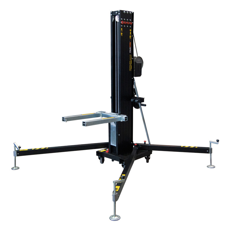 Torre elevadora de carga frontal de gran capacidad. Con un perfil más dimensionado este modelo eleva la capacidad de carga hasta los 250 kg por unidad.