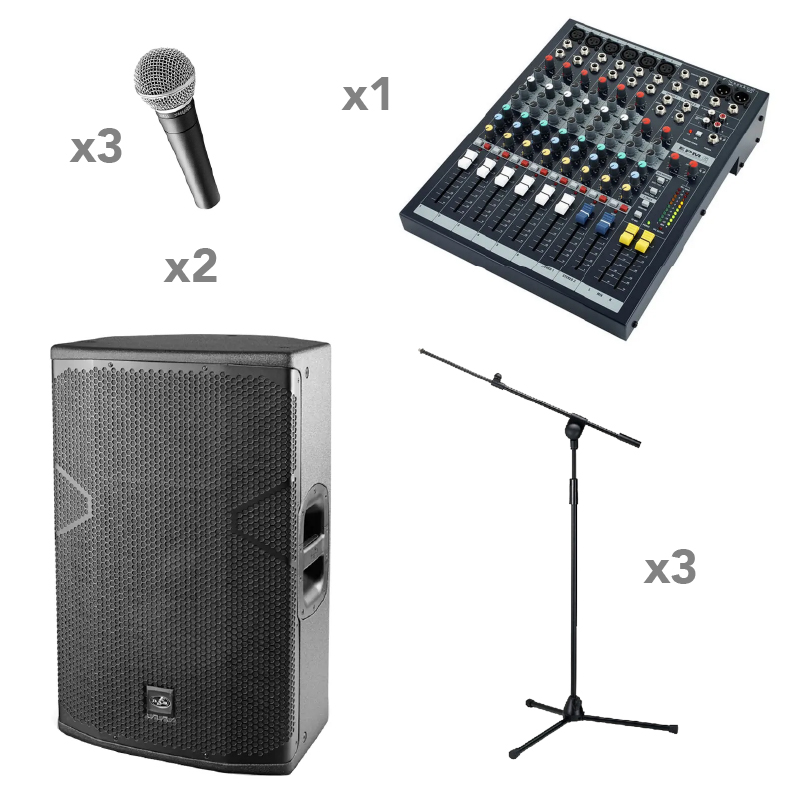 Modelo: 2 X VANTEC 15A, 1 MESA EPM6, 3 X SM58, 3 X PIES DE MICRO
