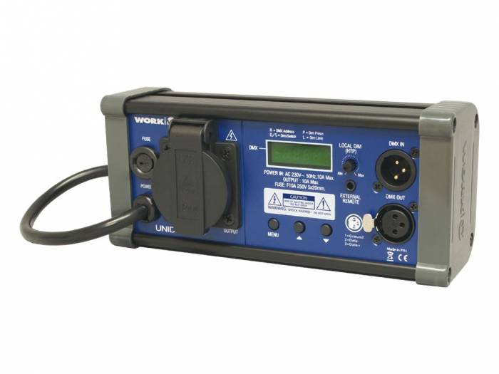 UNIDIM 1 es un dimmer DMX ultracompacto y monocanal que admite una carga máxima de 10 A. Puede utilizarse como switch para el encendido a distancia de un efecto de luz tipo scanner que no tenga canal DMX asignado para ello. Puede ser colocado sobre carril DIN o colgado de estructuras utilizando una garra o soporte adecuado. Dispone de un intuitivo menú para la configuración de parámetros tales como dirección DMX de cada canal o valores máximos de dimmerización. Todas las funciones se muestran en el display. Es compatible con dispositivos conmutadores como pedaleras o paneles de conexión cuando están funcionando como unidades driver. La salida de potencia se lleva a cabo mediante conectores tipo schucko base con tapa de protección.
